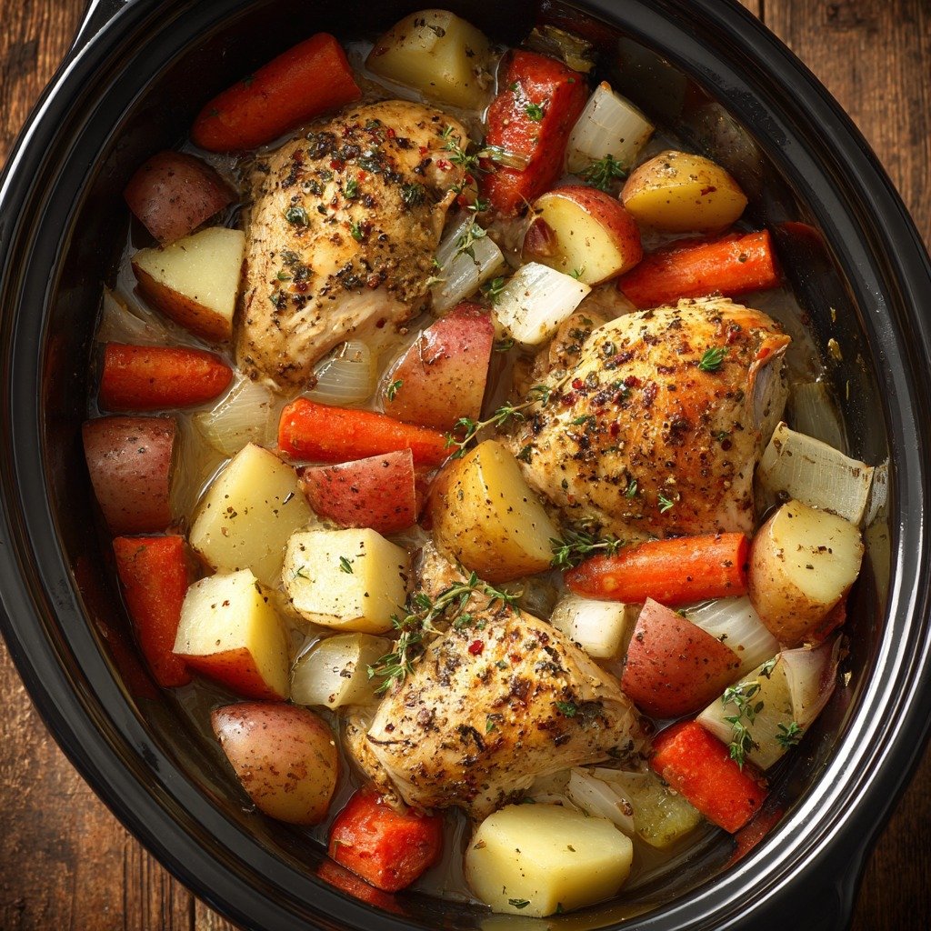 - Pile on the veggies – Scatter your potatoes, carrots, and onions over the chicken. Pro tip: put the potatoes on the bottom of the veggie pile since they take longest to cook. The onions? Just throw ’em everywhere – they’ll practically melt into the broth.