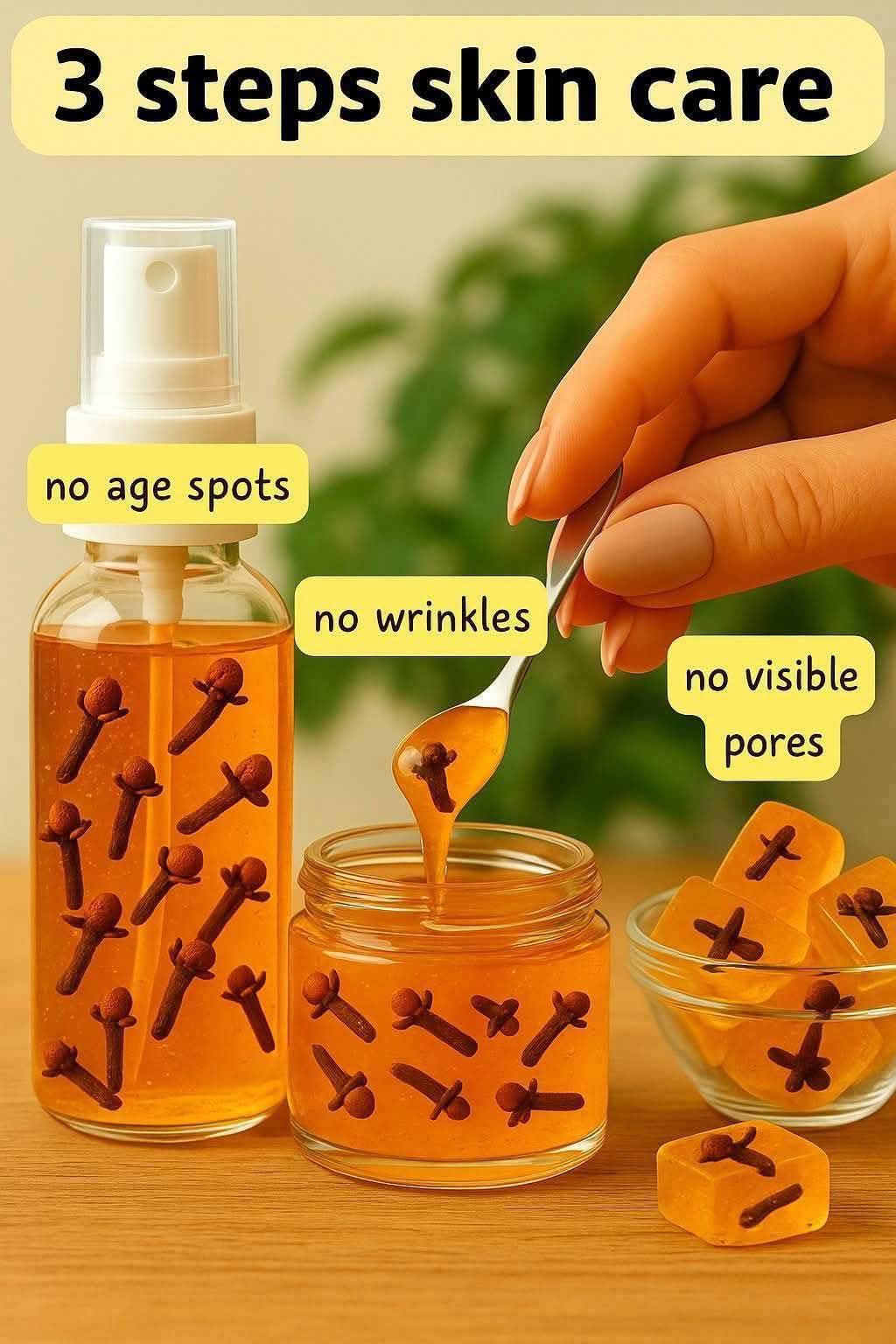Antioxidants protect from premature aging2. Clove Gel (Wrinkles + Glow Booster)Ingredients:1 tsp clove powder (grind whole cloves for best results)2 tbsp aloe vera gel (fresh or pure store-bought)2 drops tea tree oil1 vitamin E capsule (skin repair & moisture)NEW: ½ tsp raw honey (extra hydration + antibacterial)Method:Mix clove powder with aloe vera gel.Add tea tree oil, vitamin E, and honey.Store in the fridge for 7–10 days.How to Use:Apply a thin layer at night on wrinkles, scars, or acne spots.Use daily or every other day for sensitive skin.Benefits: