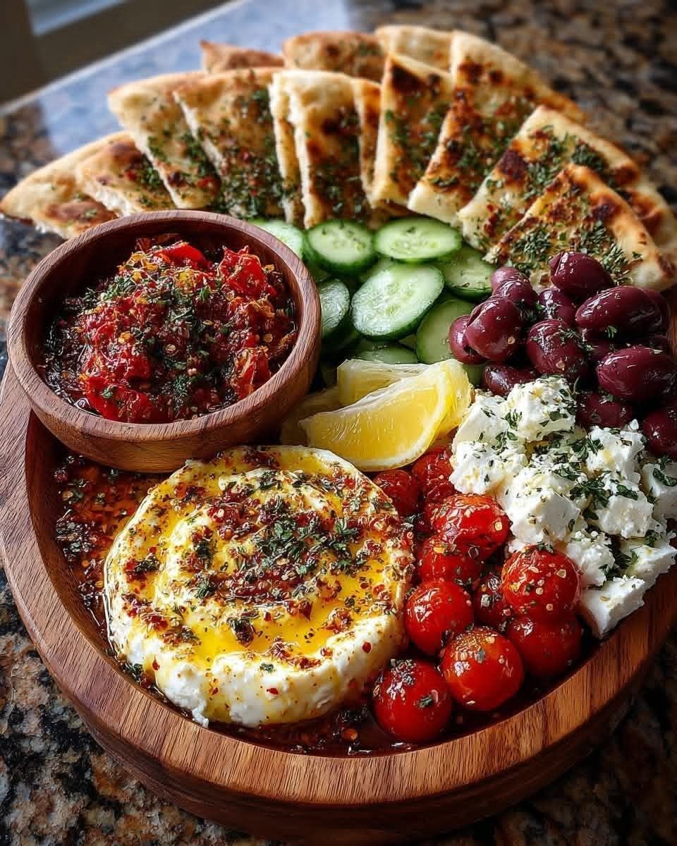 Place hot honey feta in the center, garnish with fresh herbs, and serve immediately.