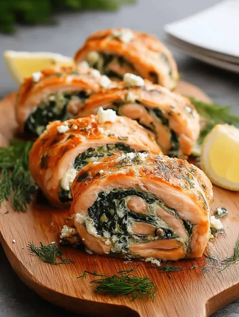 These stuffed fish rolls are a perfect mix of gourmet and healthy eating. The fresh spinach and crumbled feta make a vibrant filling. This elevates the salmon to new heights. Each pinwheel offers: